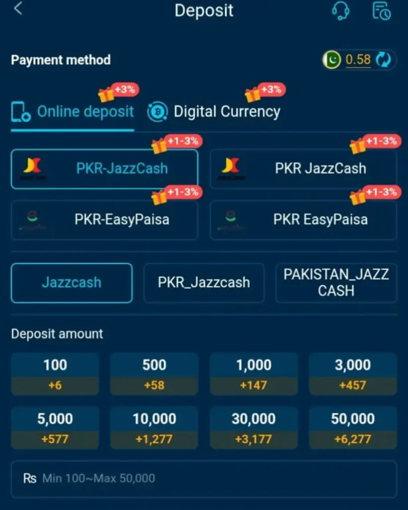 You can use Easypaisa, JazzCash, or a bank account to easily deposit or withdraw money.